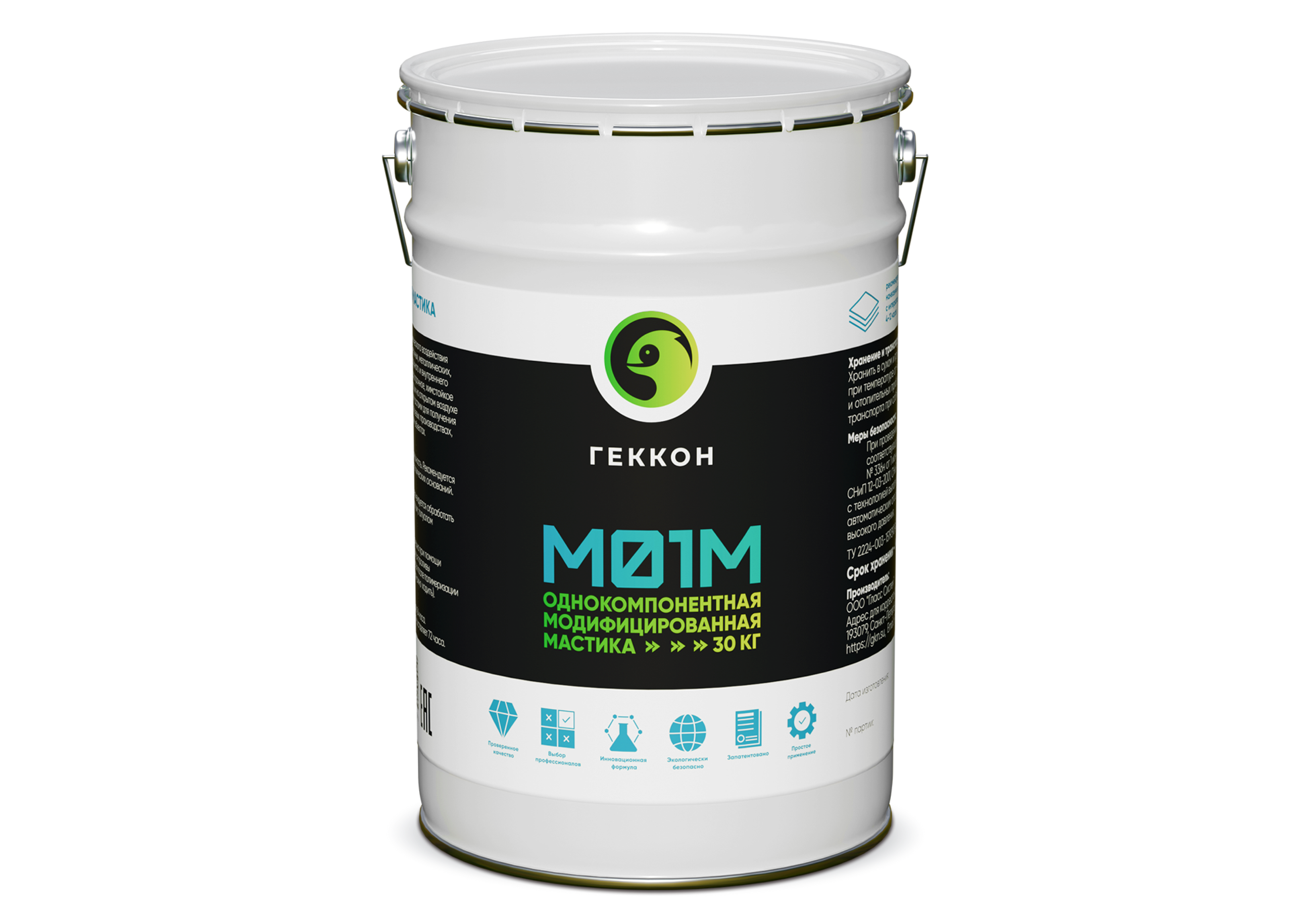 Геккон М01 М - Однокомпонентная полиуретановая мастика, специальные свойства которого обусловлены использованием наноразмерных минеральных и металлических частиц с модифицированной поверхностью с образованием бесшовных покрытий в виде прочной резиноподобной пленки на различных изолируемых поверхностях. Мастика может поставляться в биозащитном исполнении (защита от бактерий и биологического разрушения) для эксплуатации в условиях тропического климата.